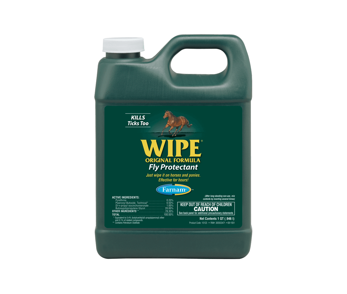 Horse owners have been relying on Wipe® fly control products for more than 40 years. This dependable protectant repels and kills horse, house, stable and deer flies, gnats and mosquitoes for long-lasting protection. The convenient wipe-on formula also helps remove dirt and dandruff from your horse’s coat.