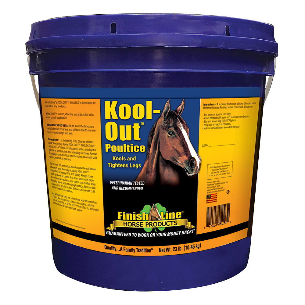 Kool-Out™ Poultice is an aid in the temporary relief of minor stiffness and soreness due to overexertion. Equine skin is 8–10 times more sensitive than human skin; Kool-Out™ was formulated especially for sensitive horses. Kool-Out™ non-medicated poultice is creamy and smooth, it goes on easy and washes off easy. Finish Line®’s Kool-Out™ Poultice is mild enough for everyday use and for horses with sensitive skin, can be used over minor nicks and cuts. It cools and tightens your horse’s legs after workouts, performances, events, and races. Also used as a hoof packing.
