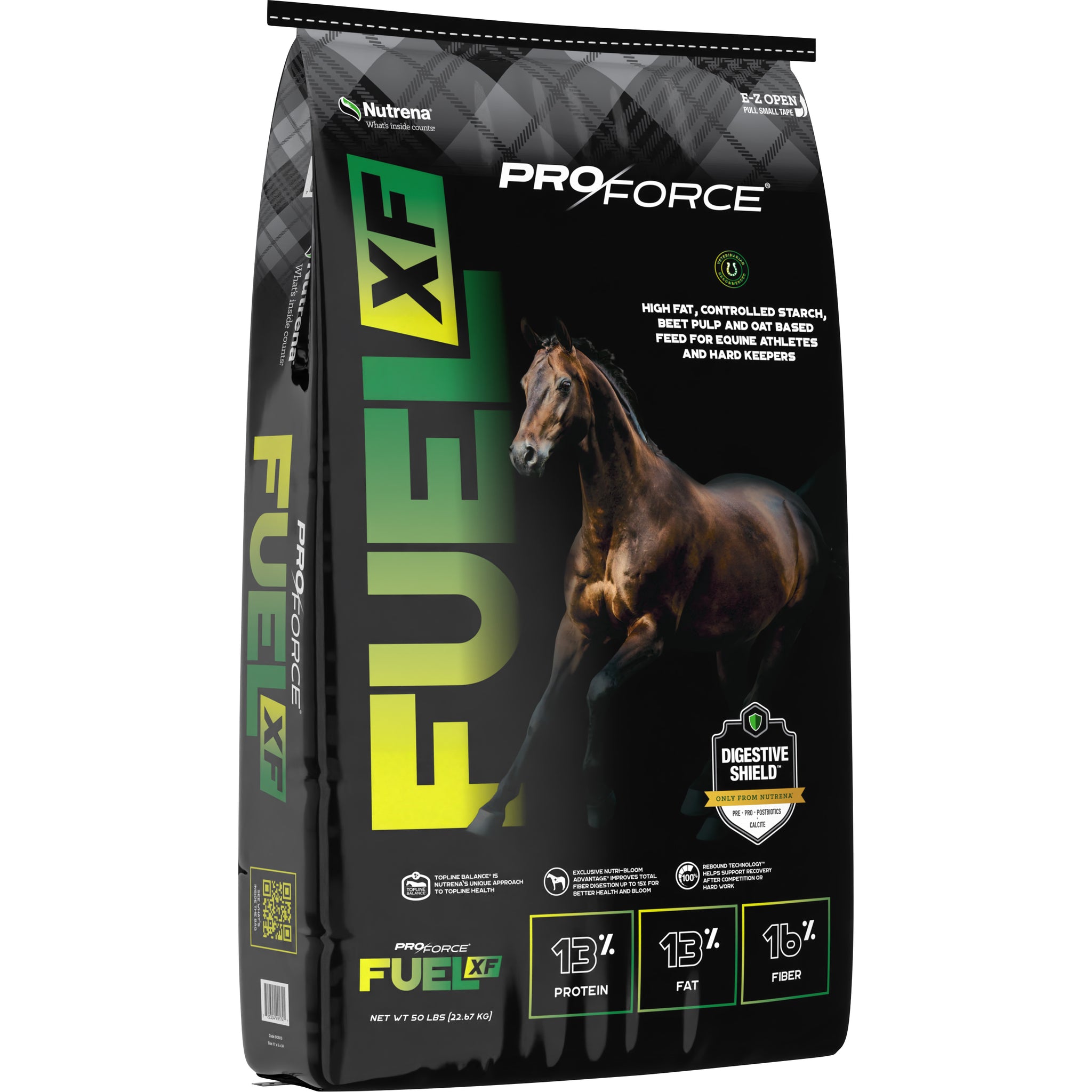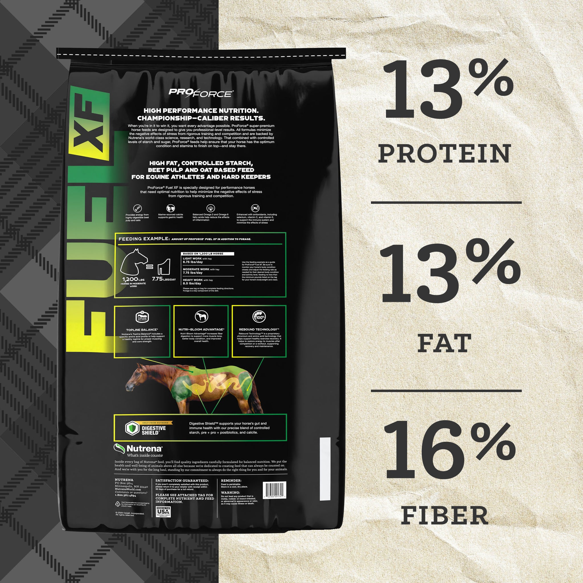 ProForce® Fuel XF is a high fat, controlled starch, beet pulp and oat based feed. It is specifically designed for performance hroses that need optimal nutrition to help minimize the negative effects of stress from rigorous training and competition. High fat, controlled starch, beet pulp and oat based feed for equine athletes and hard keepers