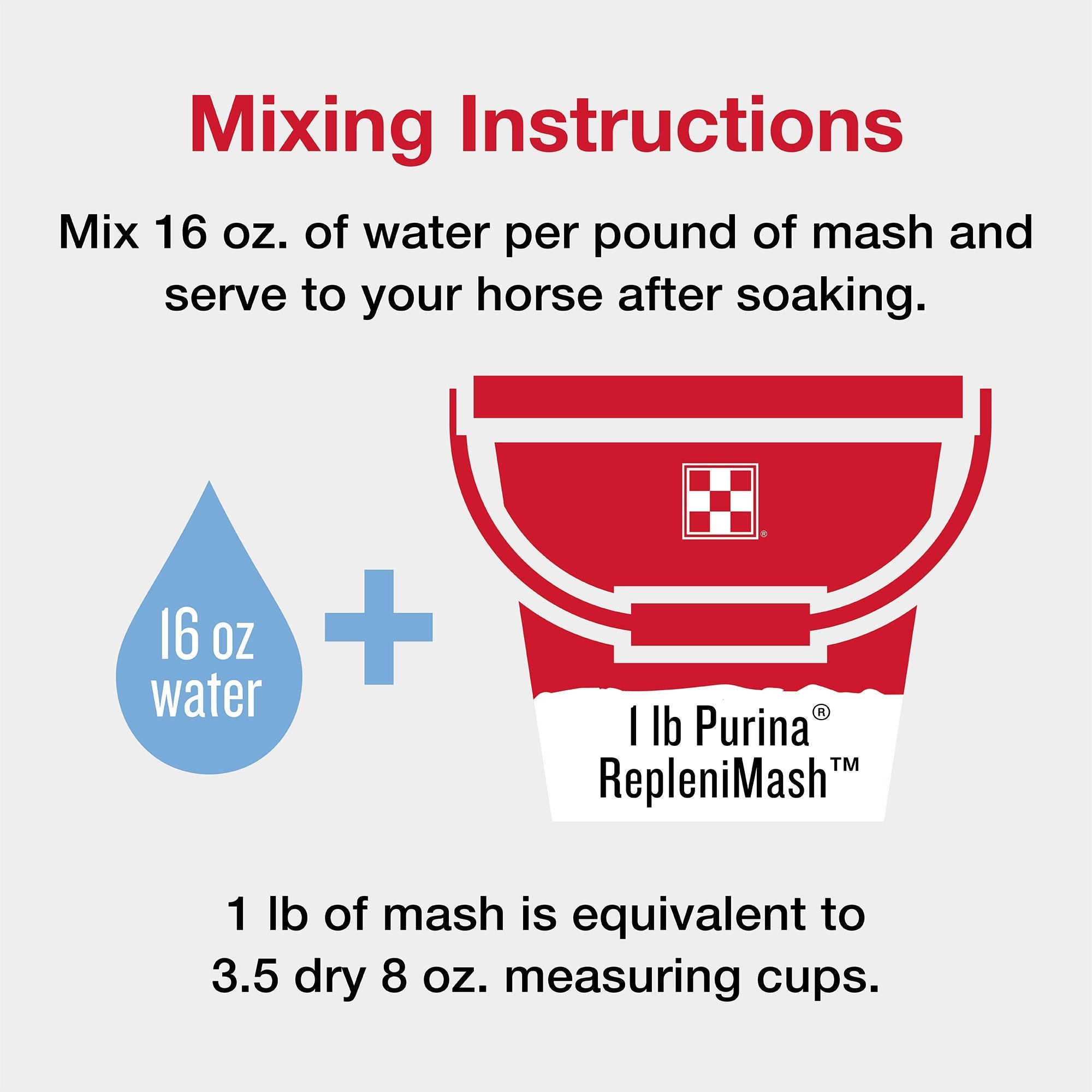 Directions for use: Feed 1 – 2 lbs (0.1 – 0.2 lbs per 100 lbs body weight) per day for all life stages of horses, or as needed depending on desired level of support. If feeding as the sole concentrate: use 0.3 lbs of Purina® RepleniMash™ product per 100 lbs body weight per day, along with 1.2 lbs per 100 lbs body weight per day in hay or pasture.