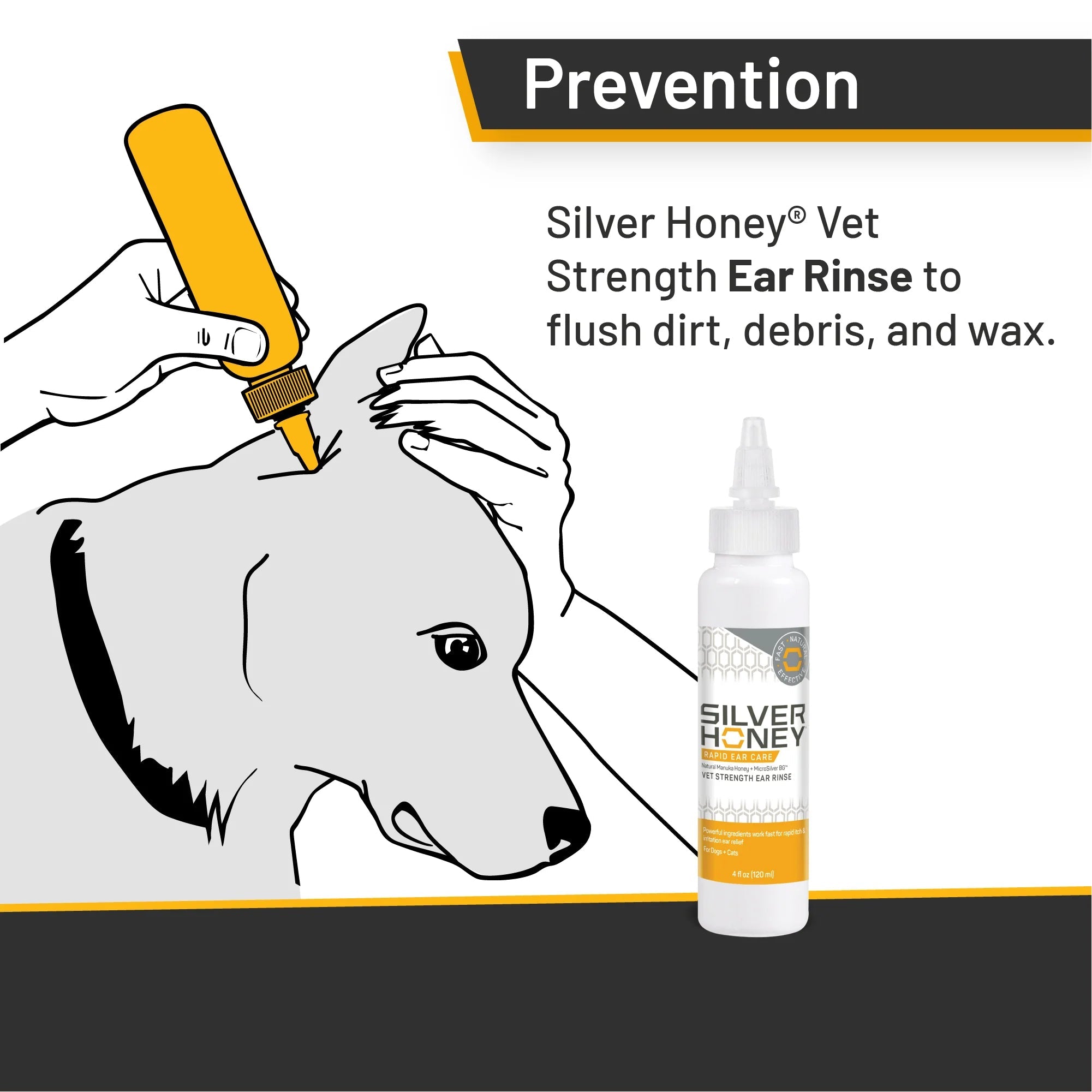 NEW Silver Honey® Rapid Ear Care is a line of revolutionary ear care solutions for all types of ear care needs. Silver Honey® Vet Strength Ear Rinse is a great cleansing solution for ongoing ear health, to keep ears free of debris, and help dogs with swimmer’s ear. 4 fl. oz. Bottle.