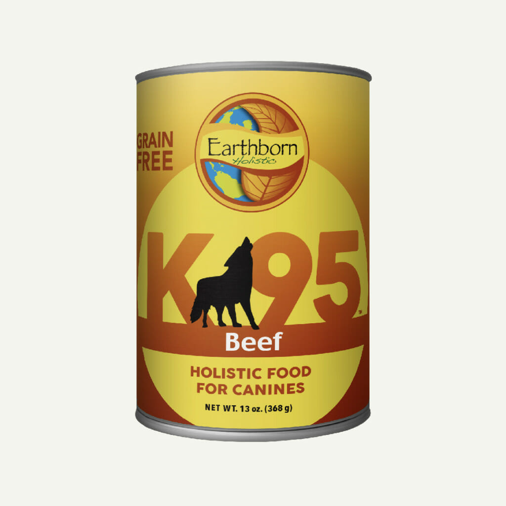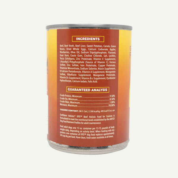 Earthborn Holistic K95 Beef dog food is a single meat protein wet dog food made with real beef protein. This grain- and gluten-free holistic canned dog food recipe is crafted with wholesome fruits and veggies and added essential vitamins and minerals. Our K95 recipes can be served as a tasty stand-alone meal or as a topper or mixer added to your dog’s regular dinner.