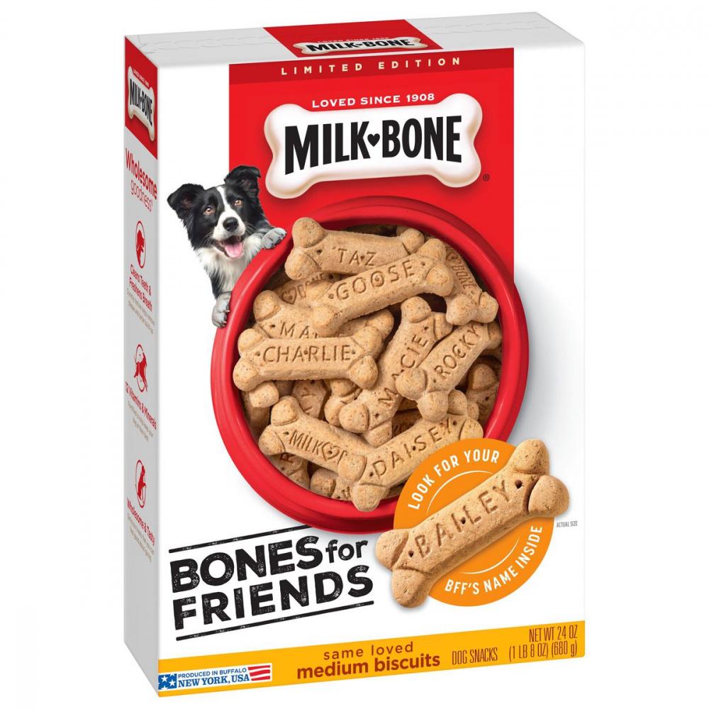 Now your best friend’s dog biscuit can literally have your dog’s name on it! Milk-Bone® Bones for Friends — a.k.a. BFF — are limited edition versions of the classic Milk-Bone dog biscuits your best bud already loves, but with popular dog names imprinted on them such as Bailey, Charlie, Daisey and Duke. So they’re even more fun! And just like the original Milk-Bone dog biscuits, these tasty treats have a crunchy texture that helps remove plaque and tartar build-up. They’re even fortified with 12 vitamins and minerals to help support your dog’s overall wellness, making them a wholesome and delicious way to celebrate your Best Furry Friend.