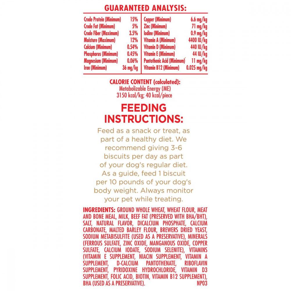 Wheat Flour, Wheat Bran, Meat and Bone Meal, Milk, Wheat Germ, Beef Fat (Preserved with BHA), Salt, Natural Flavor, Dicalcium Phosphate, Calcium Carbonate, Brewer's Dried Yeast, Malted Barley Flour, Sodium Metabisulfite (Used As A Preservative), Choline Chloride, Minerals (Ferrous Sulfate, Zinc Oxide, Manganous Oxide, Copper Sulfate, Calcium Iodate, Sodium Selenite), Vitamins (Vitamin E Supplement, Vitamin A Supplement, Niacin Supplement, D-Calcium Pantothenate, Riboflavin Supplement, Pyridoxine Hydrochloride, Vitamin D3 Supplement, Folic Acid, Biotin, Vitamin B12 Supplement), BHA (Used As A Preservative).Guaranteed Analysis