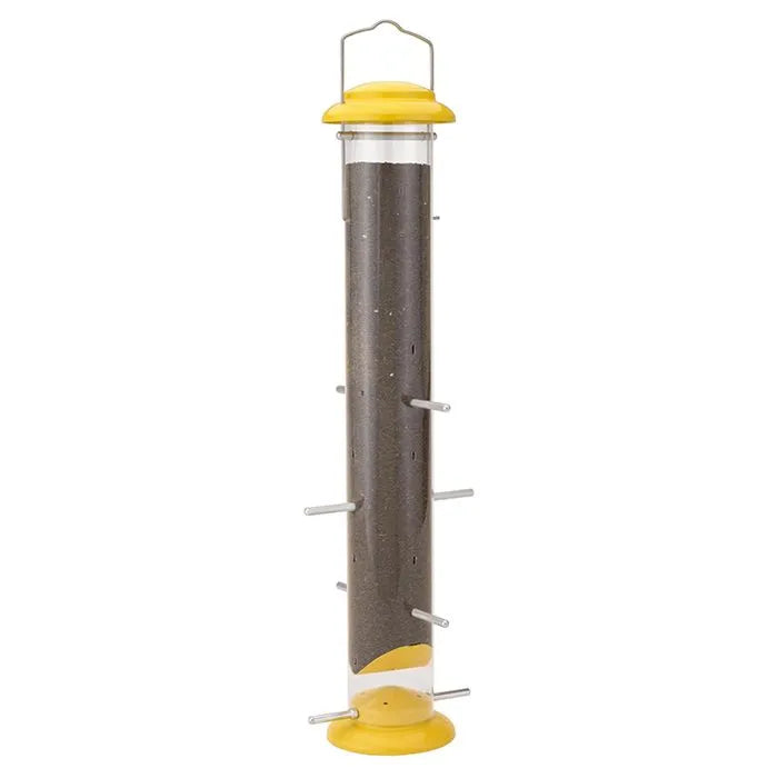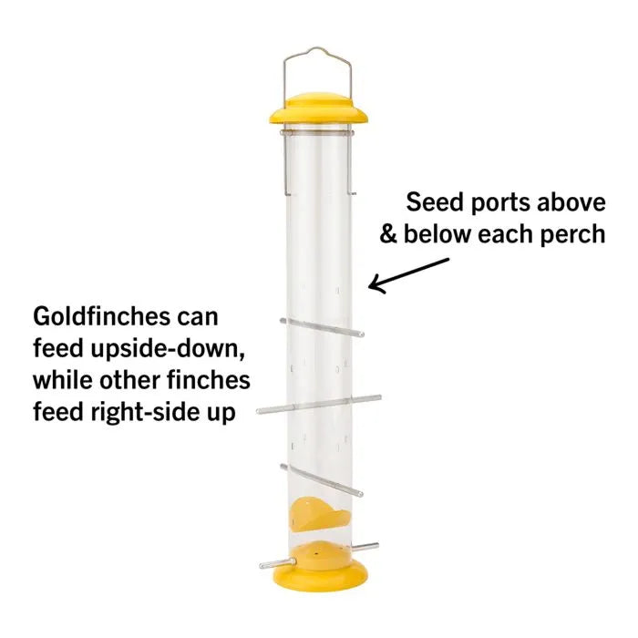 Attract every backyard finch variety with the More Birds® Topsy Tails Finch Feeder. Featuring seed ports above & below each perch, goldfinches can feed upside down while other finches feed right-side up! A built-in metal seed baffle keeps seed levels from going below the bottom seed ports, and the clear plastic seed tube holds 1.5 lb of thistle (Nyjer®) & finch mixes to keep hungry finches happy and coming back for more. The feeder is easy to fill and clean by simply sliding the cap up the pre-attached metal hanging wire. With durable metal construction and vibrant yellow powder-coating to attract more finches, the Topsy Tails is fabulous for finch feeding!