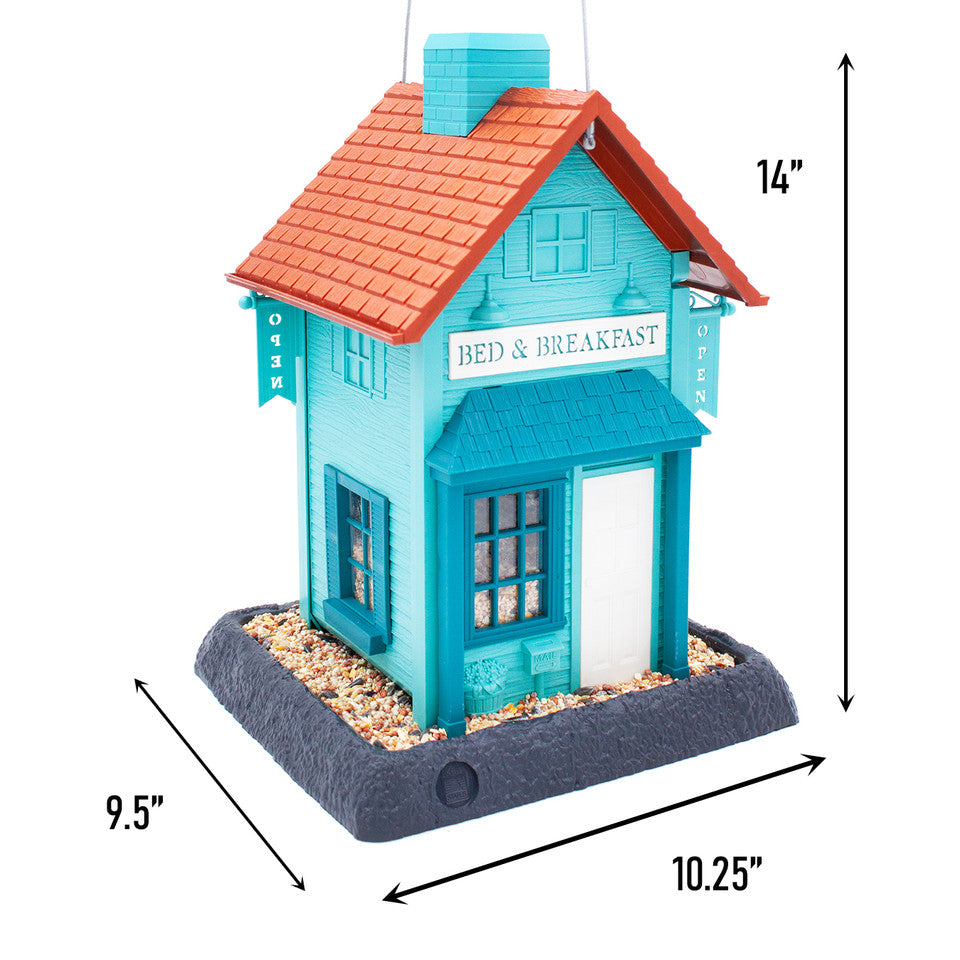 Cardinals, finches, chickadees and more will all want to eat at the cozy Bed & Breakfast. This feeder is part of our extensive Village Collection that are all are proudly made in the USA and offers a three year warranty. Made of durable plastic that will last for years to come, it features a beautiful copper color roof with tiffany blue siding and dark teal trim, as well as welcoming details like a molded mailbox and flowerpot, ‘Bed & Breakfast’ and ‘OPEN’ signs. This large capacity feeder holds an extra-large 6.5 lbs. of wildbird or sunflower seed. It is easy to clean by removing the large tray/perch, easy to refill with the lift-off chimney for mess-free pouring, and features clear plastic windows for monitoring seed levels. This versatile feeder can either be used as a hanging birdfeeder or pole mounted. It measures 9.5 x 10.25 x 14 inches high which is the perfect size for birds of all types.
