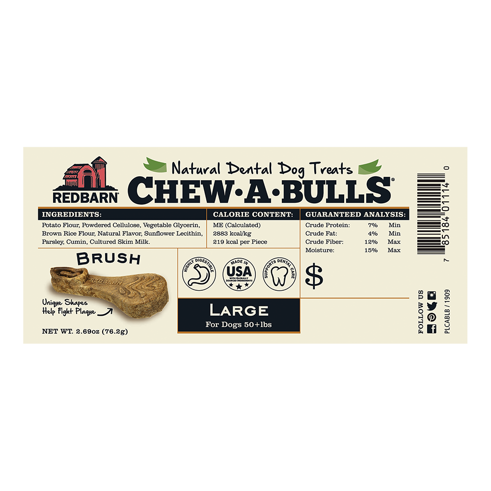 Start your pup’s daily dental routine with our new Redbarn Chew-A-Bulls® shapes. Designed with fun ridges and grooves to reach the nooks and crannies between dog’s teeth and gums, each treat helps control tartar buildup while gently massaging gums and scraping away harmful plaque. Easily digestible and made with limited ingredients, we’ve packed each treat with antioxidants like parsley and rich spices like cumin to support digestion and create an enticing scent.