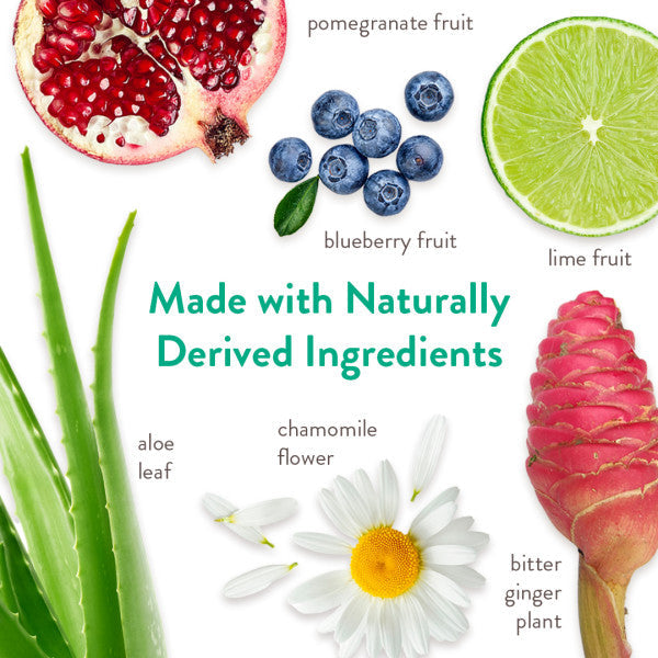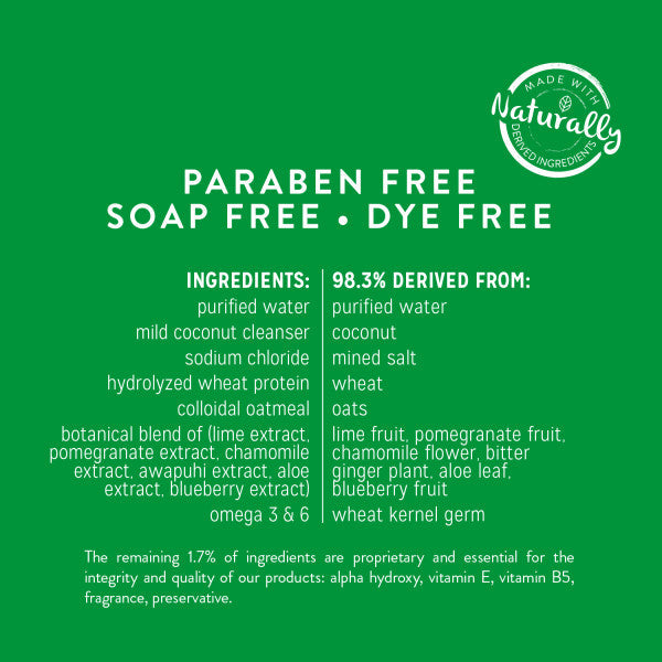 Water, Mild Coconut Cleanser, Sodium Chloride, Hydrolyzed Wheat Protein, Colloidal Oatmeal, Botanical Blend Of (Lime Extract, Pomegranate Extract, Chamomile Extract, Awapuhi Extract, Aloe Extract, Blueberry Extract), Omega 3 & 6, Alpha Hydroxy, Vitamin E, Vitamin B5, Fragrance, Preservative.