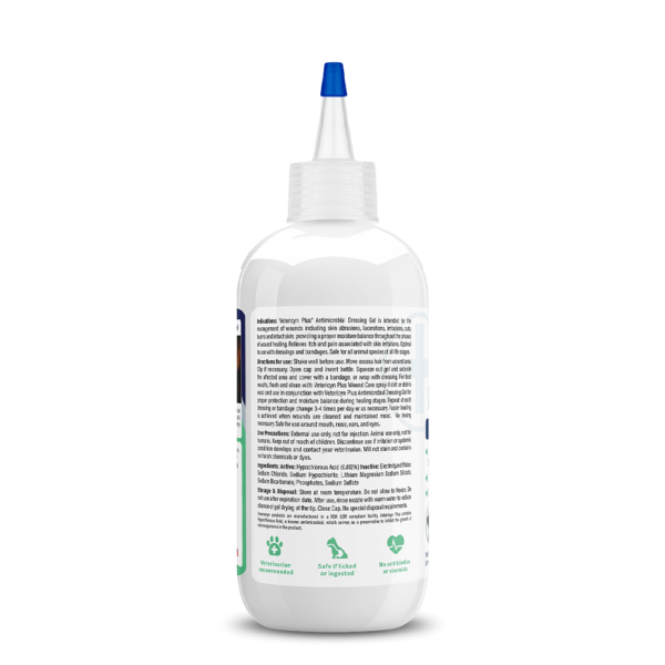 Shake well before use. Move excess hair from wound area. Clip if necessary. Open cap and invert bottle. squeeze out gel and saturate the affected area and cover with a bandage, or wrap with dressing. For best results, flush and clean with Vetericyn Plus Wound Care spray if dirt or debris exist and use in conjunction with Vetericyn Plus Antimicrobial Dressing Gel for proper protection and moisture balance during healing stages. Repeat at each dressing or bandage change 3-4 times per day or as necessary. Faster healing is achieved when wounds are cleaned and maintained moist. No rinsing necessary. Safe for use around mouth, nose, ears, and eyes.