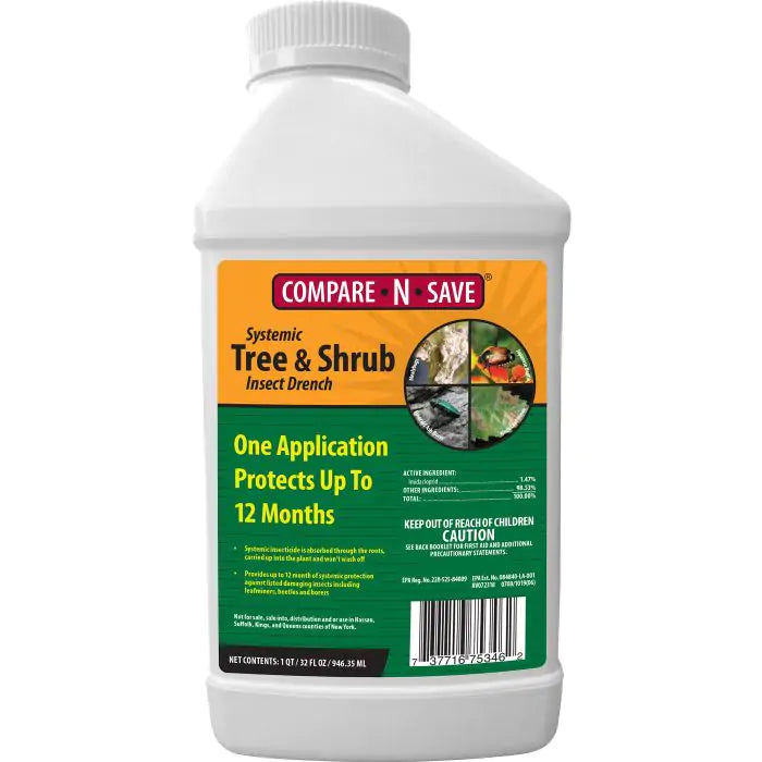 One easy application of Systemic Tree & Shrub Insect Drench with 1.47 percent imidacloprid protects plants for 12 months, and the solution is absorbed through the roots, so protection won’t wash off due to rain or regular watering.