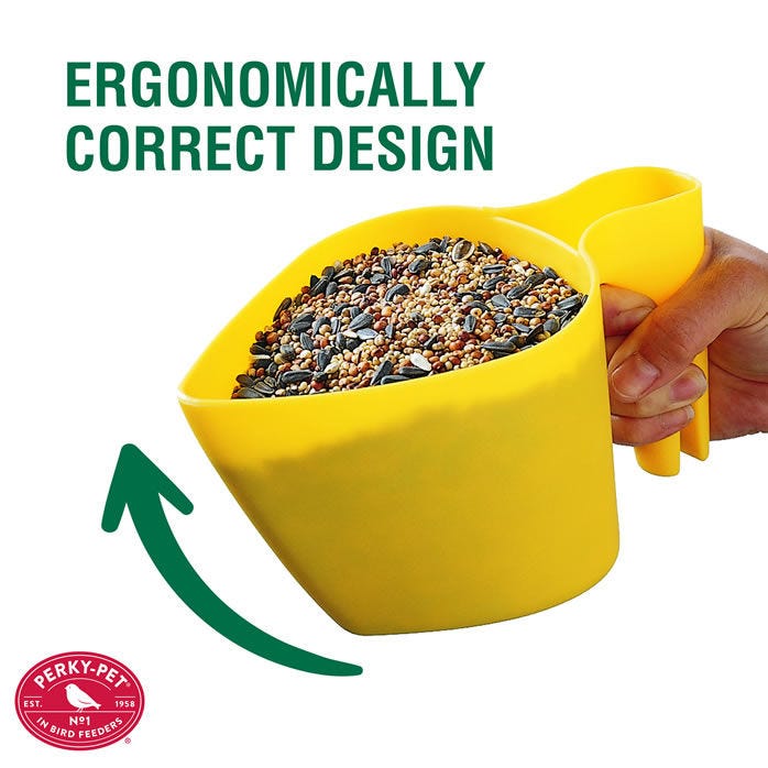The Perky-Pet® Scoop N’ Fill™ features a built-in bag clip (locks seed to keep seed fresher, longer), an ergonomically correct design and one-piece plastic construction. Bright yellow color!